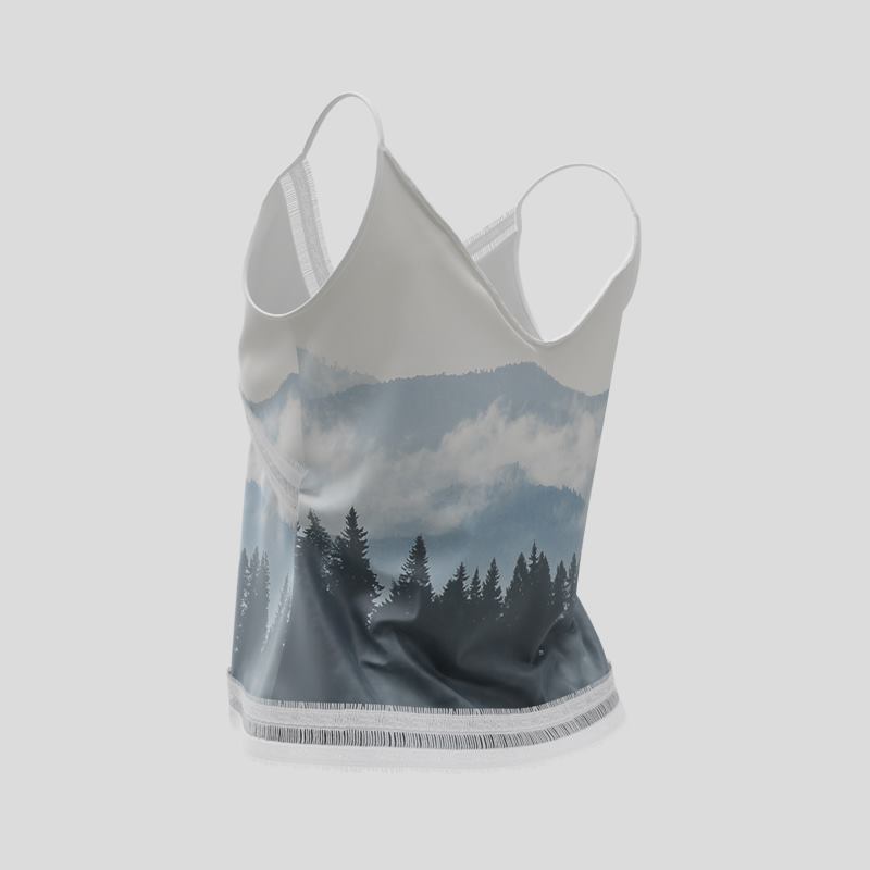 Vår cami topp med spets kombinerar lyxiga material med din egen design. Modellen är croppad med dekorativ fransspets som korsar framsidan och följer V-ringningen. Bystsnitten ger en smickrande siluett medan Silk Sensation används som kantband för extra mjuk känsla mot huden. Oavsett om du väljer glansig satin, äkta silke eller vår fjärilslena crepe förblir trycket livfullt tack vare vår avancerade teknik.