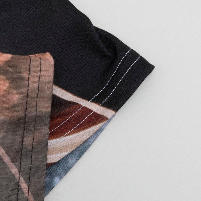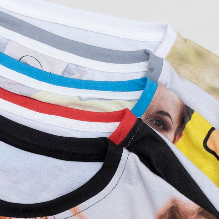 Våra skickliga tekniker tar din färdiga design och trycker den antingen på hela fram- och baksidan på din tröja, eller med ett rektangulärt, klassiskt tryck på framsidan. Du kan glömma tramsiga tröjor där trycket lätt gnuggas av eftersom de här tröjorna är skapade för att visa upp dina foton i flera, flera år. Färgämnena trycks djupt in i tygets fibrer och försäkrar att ditt tryck ser bra ut tvätt efter tvätt. Allting skärs ut och sys ihop för hand av våra skickliga sömmerskor och du kan välja mellan fem olika färger på halslinningen. Du kan välja mellan tre olika tyger: Lifestyle Recycled Poly Jersey 160gsm, Bounce Cotton Jersey 170gsm eller Supima Cotton Candy Jersey 160gsm. På grund av att alla våra produkter tillverkas för hand så kan vi inte garantera att bilder och mönster matchar varandra perfekt vid sömmarna, inklusive på axlarna.