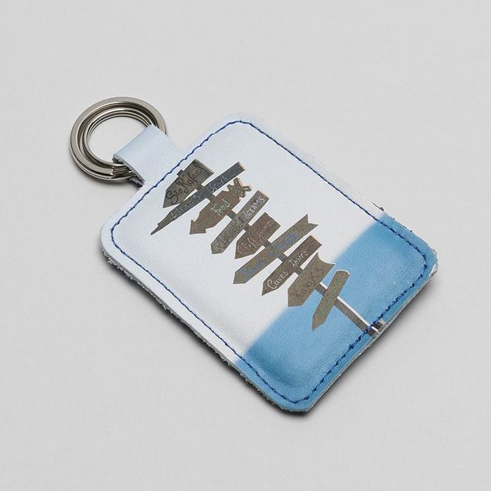 Den dubbelsidiga nyckelringen finns i två storlekar och former: En hjärtformad nyckelring som är 6,5 cm som bredast och 8 cm som högst, och en rektangulär nyckelring som är 7 x 7,5 cm.