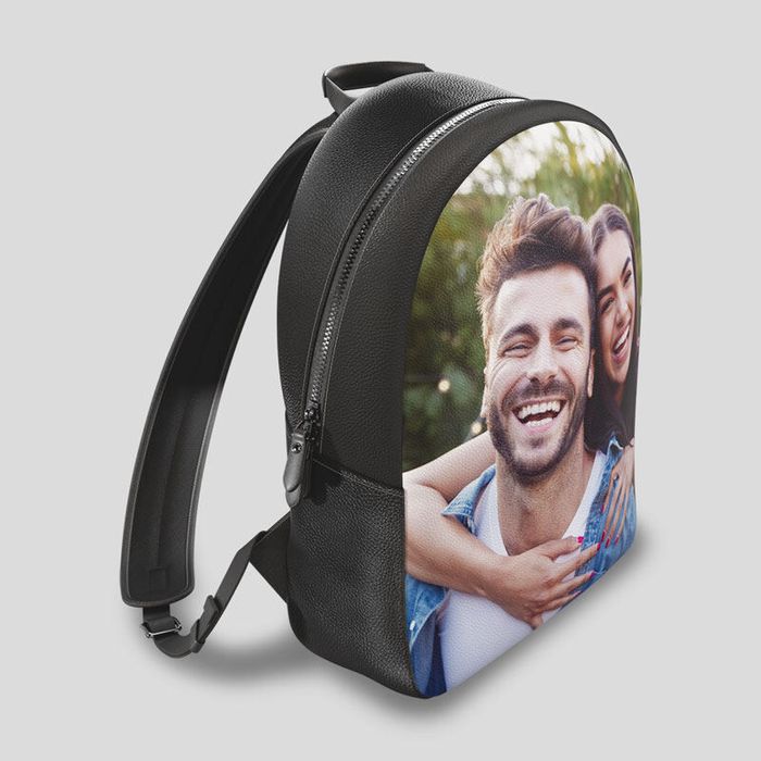 Det finns inte många regler när du ska skapa din personliga läderryggsäck. Det finns en (1) yta att designa, så du kan ladda upp en bild eller ett foto och vara klar på några minuter. Om du använder ett ensamt foto rekommenderar vi att använda lodräta bilder, då de fyller ut ytan bäst. Annars kan du skapa ett kollage med många olika bilder, eller använda design, t.ex. vattenfärgsillustrationer. Välj sedan vilken färg du vill ha på metalldetaljerna: guld, blågrå eller nickel. Du kan också välja trådfärg, grå, gräddvit eller kolfärgad. När du är klar, kan du se exakt hur din ryggsäck kommer se ut i vår 3D-förhandsvisning.