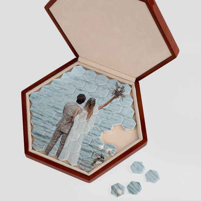 När du har designat ditt keramiskt hexagonpussel online trycker vi bilden med avancerade sublimeringsmetoder som ger djupa, klara färger. De sexkantiga brickorna bränns därefter för hållbarhet och en glasliknande finish. Slutligen placeras de i vår handgjorda pecanträlåda med mjuk sammet som både skyddar och lyfter fram ditt motiv.