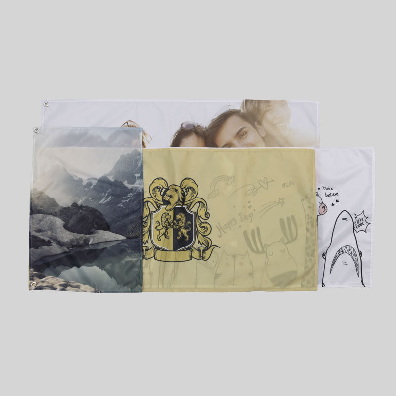 Välj bland våra standardstorlekar för flaggor eller vårt specialtillverkade flaggalternativ för att få dina personliga flaggor i valfri storlek och form. Vår tjänst är populär för specialanpassade fotbollsflaggor, rugbyflaggor och olympiska flaggor anpassade för individuella supportrar. Välj bland vårt urval av flaggstorlekar eller förinställda landsflaggor och använd dem som bas för att skapa din egen flagga genom att lägga till meddelanden, namn, grafik eller text. Från en enda bild till en collage-liknande flagga, skriv ut din egen flagga med våra enkla montageverktyg och förhandsgranska din beställning för att uppnå önskat utseende.