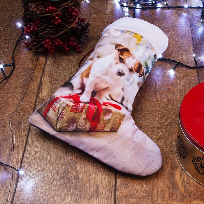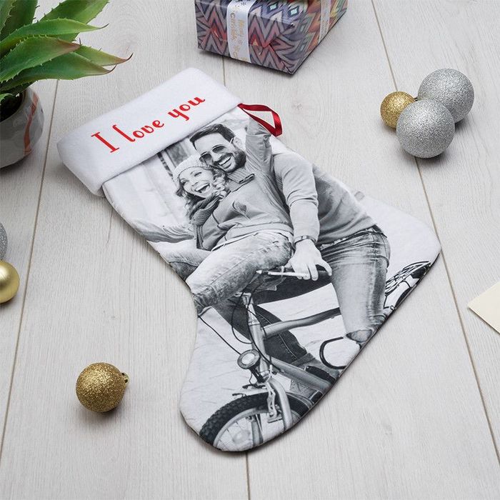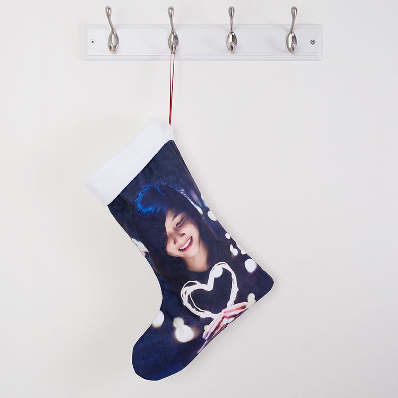 En julstrumpa med namn gör julaftonsmorgonen ännu mer magisk. I vårt enkla onlineverktyg laddar du upp bilder, skriver text och placerar motiven precis där du vill. Har du flera favoritbilder? Skapa ett kollage med ett klick. Allt trycks i klara färger över hela den mjuka sammeten.