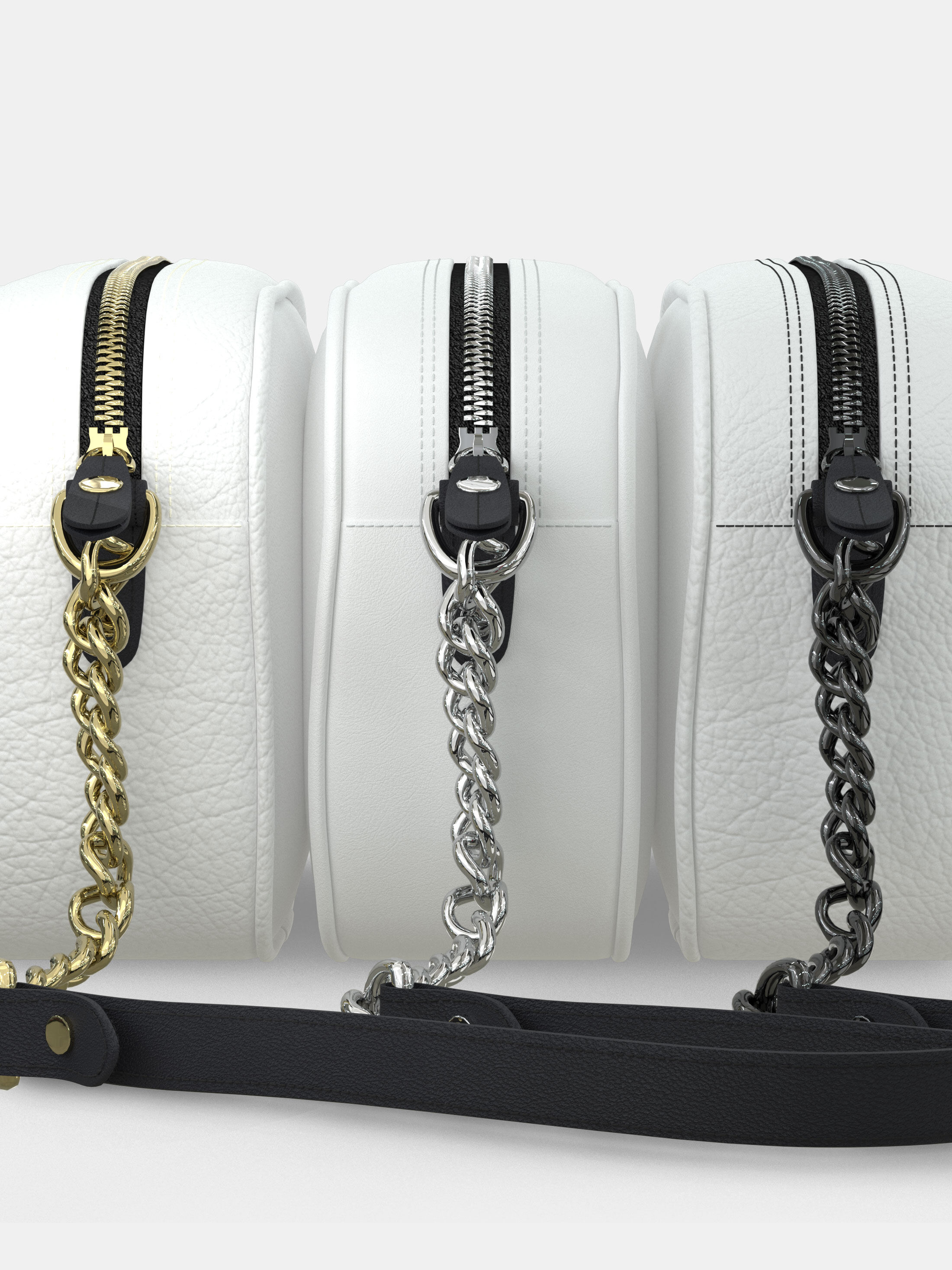 Vi lägger sedan till blixtlåsen, gjorda av blågrå, guldig eller silvrig metall. Sist lägger vi till den axelrem du valt. Om du väljer remmen med kedja så går denna inte att ta av. Men du kan välja remmen med klämmor om du vill kunna ta av remmen vid behov. Läderremmen och blixtlåsens dragtappar målas för hand på kanterna för att ge en snygg och stilig finish.