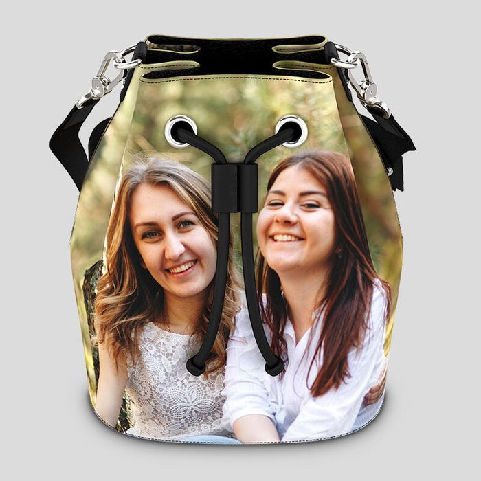 Detaljerna på din väska görs alla av lent Nappaläder. Detta inkluderar dragsnöret, fliken som anpassar remmen, flikarna som håller remmen, och väskans botten. Den svarta färgen komplimenterar din design utan att stjäla uppmärksamhet från vad du valt att trycka på din personliga väska.