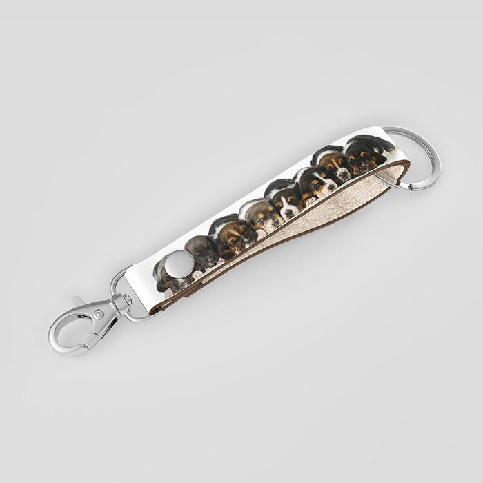 Remsan är smal, så välj ett motiv som fungerar i panorama eller ett tydligt porträtt. Ett kort citat eller ett namn gör sig också bra på en nyckelkedja med namn.