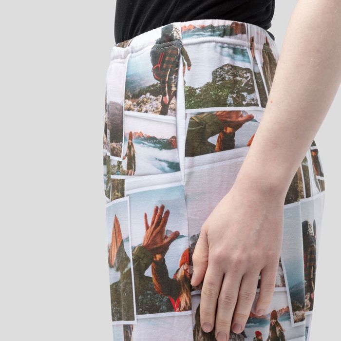 Du har 5 områden att designa på din personliga pyjamas; fram- och baksidan av båda benen samt en personlig etikett. Har du många foton och inte riktigt kan välja ut vilka som du vill ha tryckt på din pyjamas så kan du enkelt skapa ett fotocollage. Du kan välja en fotocollagemall och sedan genererar vår app ett slumpmässigt fotocollage. Gör något roligt med dina foton och blås liv i gamla minnen!