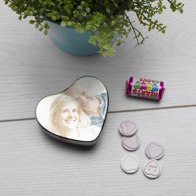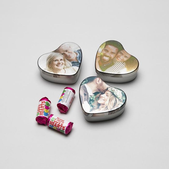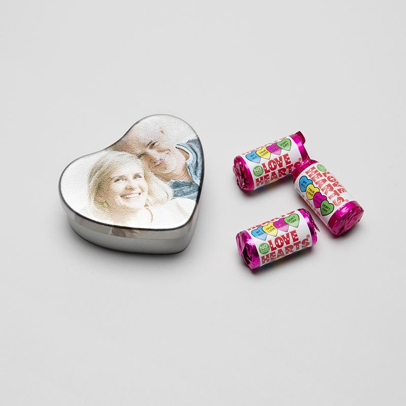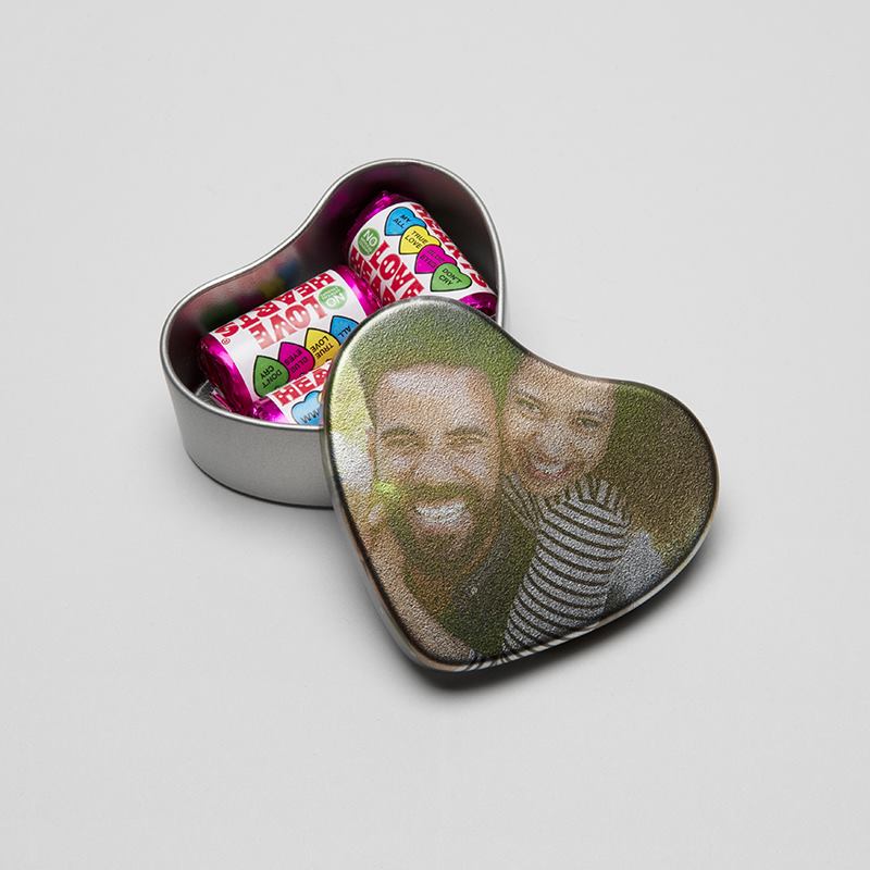 Dessa små gulliga hjärtformade plåtburkar med eget tryck är ett underbart sätt att visa din kärlek och uppskattning. I vårt onlineverktyg kan du skräddarsy plåtburken med egna foton och texter. Klicka på knappen "Starta Design" här ovan för att komma till vårt enkla onlineverktyg där du kan ladda upp bilder och text för att designa din plåtburk. Låt din älskling veta hur mycket du älskar dem med en hjärtformad plåtburk fylld med GRATIS Love Hearts godisbitar och kanske något annat skinande om det är dags att fråga den stora frågan...