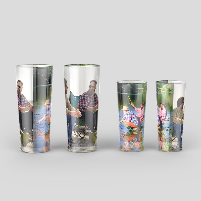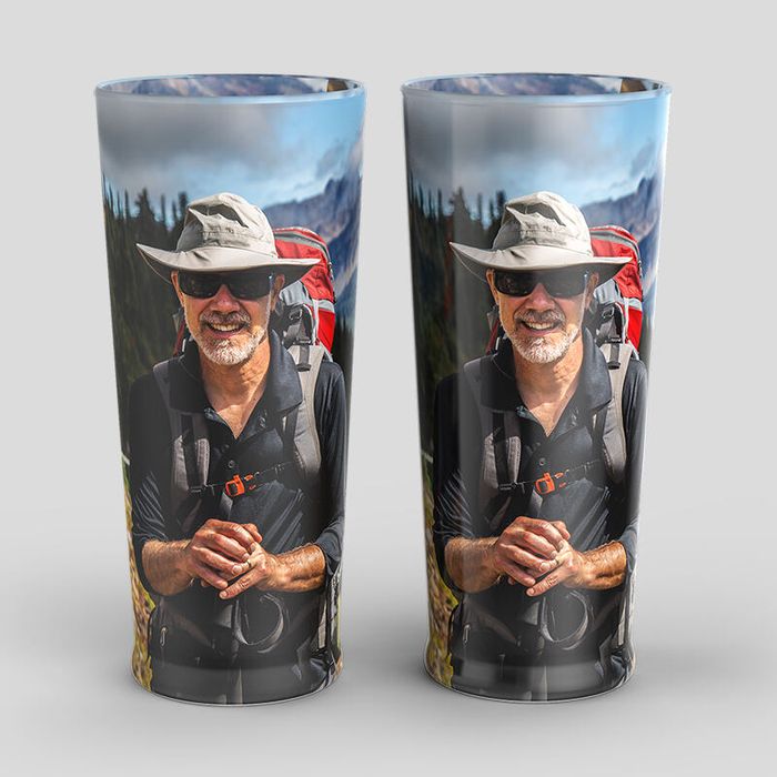 Att ta ett glas med sina vänner är ett av livets enkla nöjen. Håll dem nära hela tiden genom att trycka dina favoritbilder på personliga ölglas. Glasen är stabila, det lilla glaset är 2mm tjockt och det stora 2,5mm tjockt. Båda har en tjockare fot, 1,5cm, som ger glasen en stadig känsla. De är bredare på toppen än vad de är vid foten, som alla traditionella ölglas. Det bästa är att du kan skräddarsy dessa glas att se ut precis som hur du vill, ända ner till finishen. Vår frostade finish är matt, medan det glansiga alternativet toppas med en skimrande beläggning. Färger kommer att vara lika livfulla oavsett vilken finish du väljer, så det handlar helt enkelt om vad du gillar bäst.