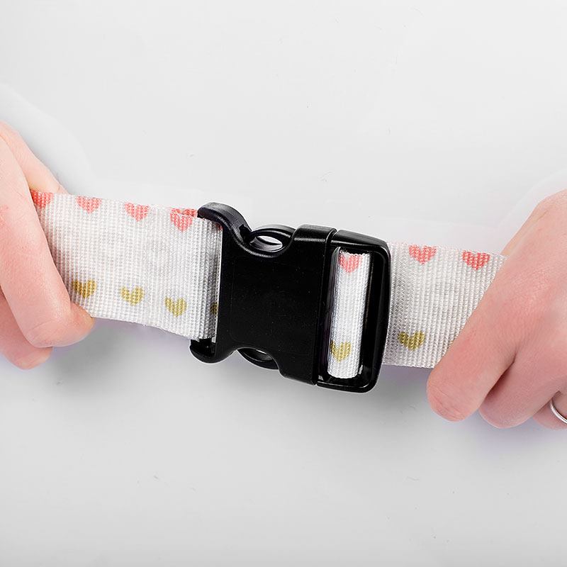 Ibland kan det känna som att alla resväskor ser exakt likadana ut när de kommer ut på bagagebandet. Men med ett personligt bagageband blir det lekande lätt att identifiera din väska från alla andras och ingen annan kommer garanterat att ta fel väska. Ditt bagageband med eget tryck tillverkas av slitstark vävd polyester med ett starkt spänne som håller ihop din väska under resans gång. Designa ditt eget bagageband online genom att klicka på knappen "Starta Design" för att komma till vårt enkla onlineverktyg.