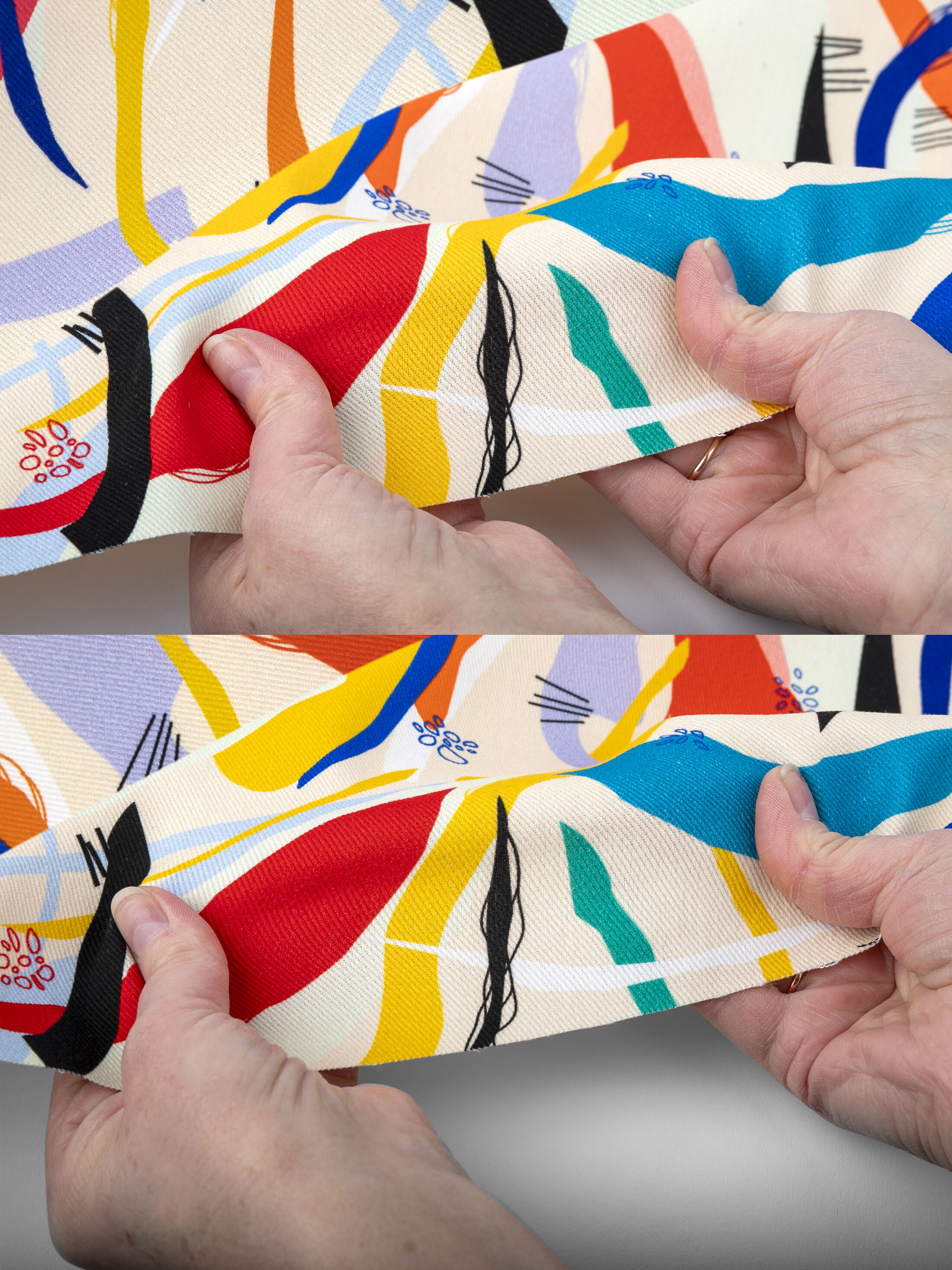 Avfärgning, alltså den blekning av färg som uppstår längs veck i ett tyg. Detta händer oftast efter upprepad tvätt eller tung användning av digitalt tryckta naturliga textiler. Avfärgning kan minimeras genom att handtvätta tygerna vid en lägre temperatur istället för att tvätta dem i maskin. Om du vill undvika avfärgning helt så råder vi dig att använda ett poly-baserat tyg.