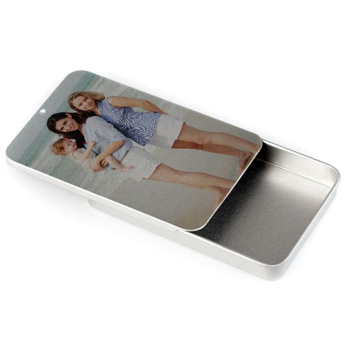 När du beställer en personlig visitkortshållare online hos oss producerar vi din anpassade visitkortshållare på beställning med högupplöst direkttryck på locket i rostfri metall. Resultatet är en slitstark finish som tål vardagligt bruk och som visar upp dina färger med fantastisk klarhet. Det smidiga skjutlocket glider över en liten låsflik som håller dina kort säkra.